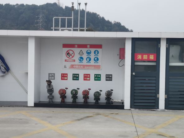 加油站安裝有汽油卸油和加油油氣回收系統(tǒng)。加油區(qū)設(shè)置加油罩棚,罩棚為鋼架結(jié)構(gòu),罩棚下設(shè)置2臺三油品六槍潛油泵式加油機(jī)、1臺單油品四槍潛油泵式加油機(jī)、1臺雙油品四槍潛油泵式加油機(jī)、1臺尿素加注機(jī);埋地罐區(qū)設(shè)有5只30m³埋地臥式鋼制單層油罐(防滲罐池內(nèi)),其中汽油罐4只(分別為92#汽油罐2只、95#和98#汽油罐各1只),柴油罐1只,油罐總?cè)莘e折算為135m3(柴油罐折半計(jì)入),根據(jù)《汽車加油加氣加氫站技術(shù)標(biāo)準(zhǔn)》GB50156-2021的相關(guān)規(guī)定,該加油站為二級加油站。